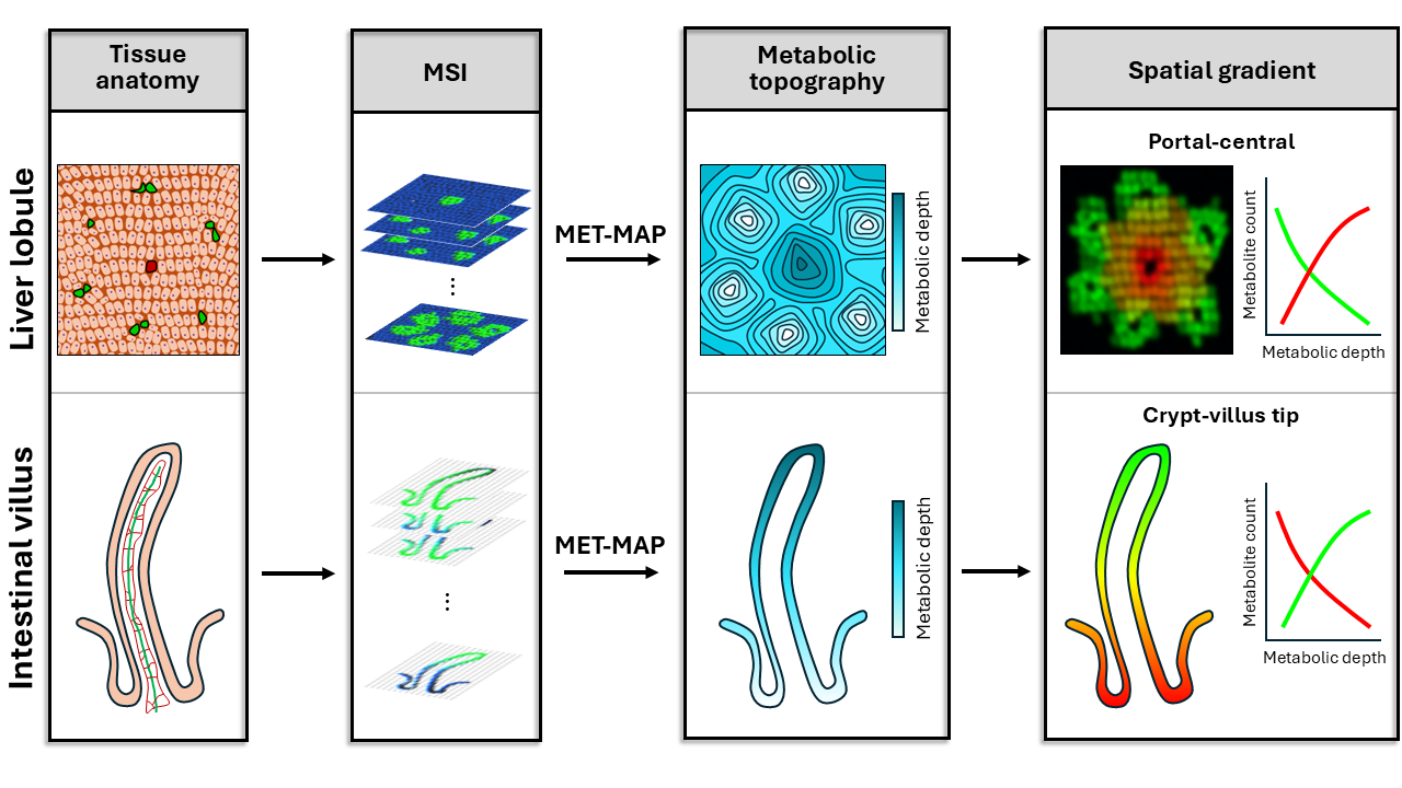 This app provides interactive visualization of spatial metabolite distributions and metabolic gradients in murine liver and small-intestine epithelium. Users can explore the metabolic topography which delineates liver portal-central and intestinal crypt-villus-tip metabolic gradients. Users can also view images and spatial gradients for selected metabolites and lipids acquired by MALDI imaging mass spectrometry.